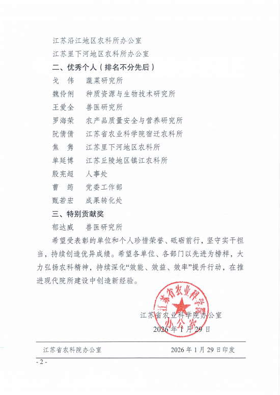 近日,江苏省农业科学院对2025年度院系统办公室先进集体和优秀个人进行了表彰。所办公室荣获“2025年度院系统办公室先进集体”称号。同时,办公室焦隽同志被评为“优秀个人”。