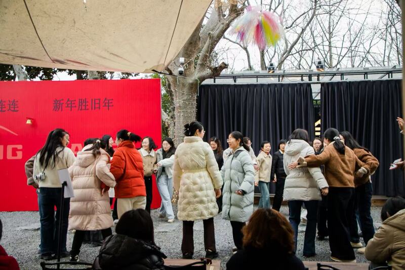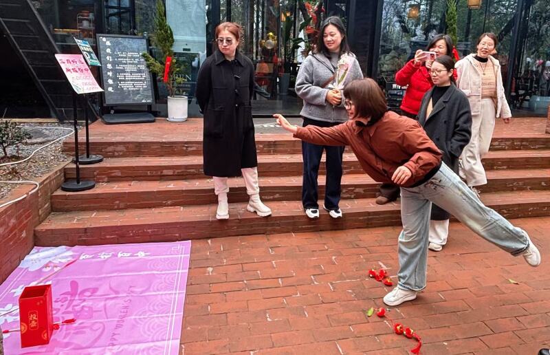 手作体验之余,轻松活泼的互动游戏环节让现场欢笑不断。“春日投壶”率先开场,大家手持箭矢屏息凝神,投中时的欢呼与脱靶时的惋惜交织,传统游戏的乐趣在此刻尽情绽放。“爱的抱抱”游戏紧随其后,伴随着主持人口令声,大家迅速组团抱拢,有人精准入群胜出,有人落单引得全场欢笑,现场气氛瞬间升温。“数字炸弹”环节则将活动推向高潮,大家依次报数、凝神应对,紧张与欢笑交织。三轮游戏下来,大家的距离在互动中悄然拉近。